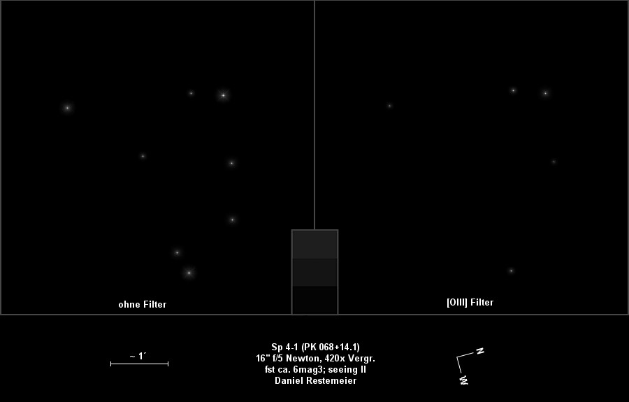 Den Rückschlag von eben will ich so nicht hinnehmen und deswegen gehts nun dem nächsten Mini-PN Sp 4-1 (PK 068+14.1) in der Leier an den Kragen. Nach wenigen Minuten bin ich an der richtigen Stelle und schon mit 100x kann ich den nur 2" kleinen PN eindeutig als Sternchen neben einem helleren Stern sehen. Selbst mit 525x bleibt der PN absolut sternförmig, seine wahre Natur lässt sich jedoch dennoch eindeutig wegen seinem verräterischen Hang zum [OIII]-Leuchten erkennen.