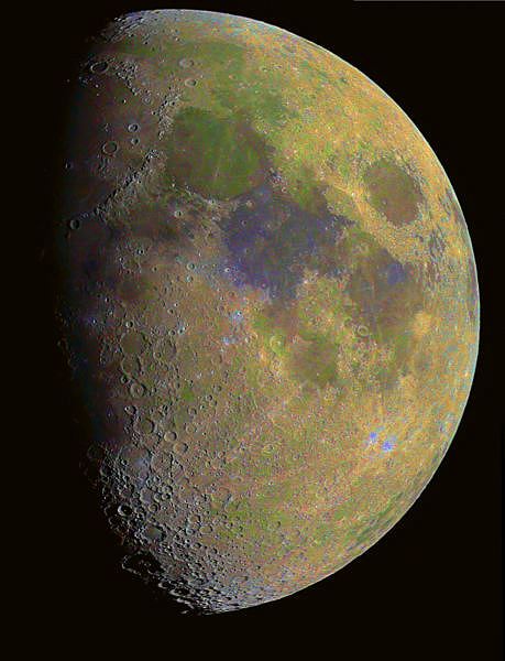 Eigentlich wollte ich nur durch Differenzbildung sehen, was eine bestimmte Routine an einem Bild verändert. Dazu bildete ich die Differenz zum Ausgangsbild. Dabei trat eine leichte Verfärbung zu tage, die ich dann noch kräftig verstärkt habe. Die Farben haben mit Sicherheit nichts mit dem Farben auf dem Mond zu tun, aber irgendwie sah es interessant aus.