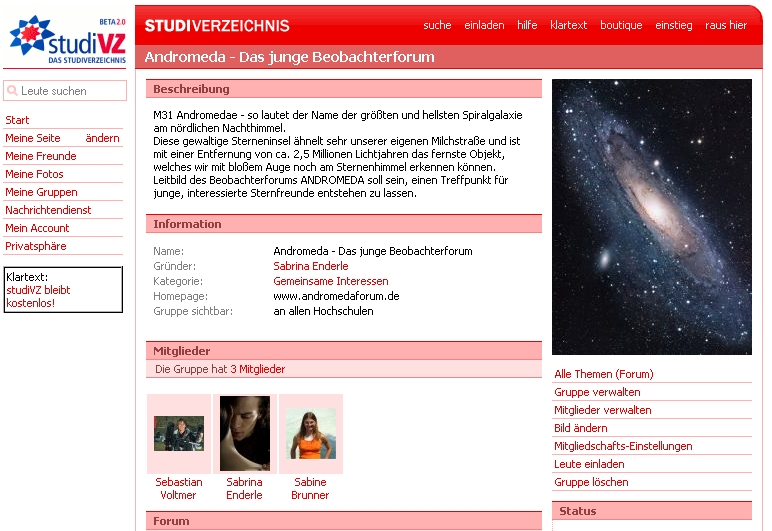 Also gut: http://www.studivz.net/Hier können sich Studenten anmelden, dann kann man unter Suche -> Gruppen die Gruppe "Andromeda - das junge Beobachterforum" suchen und ihr beitreten.