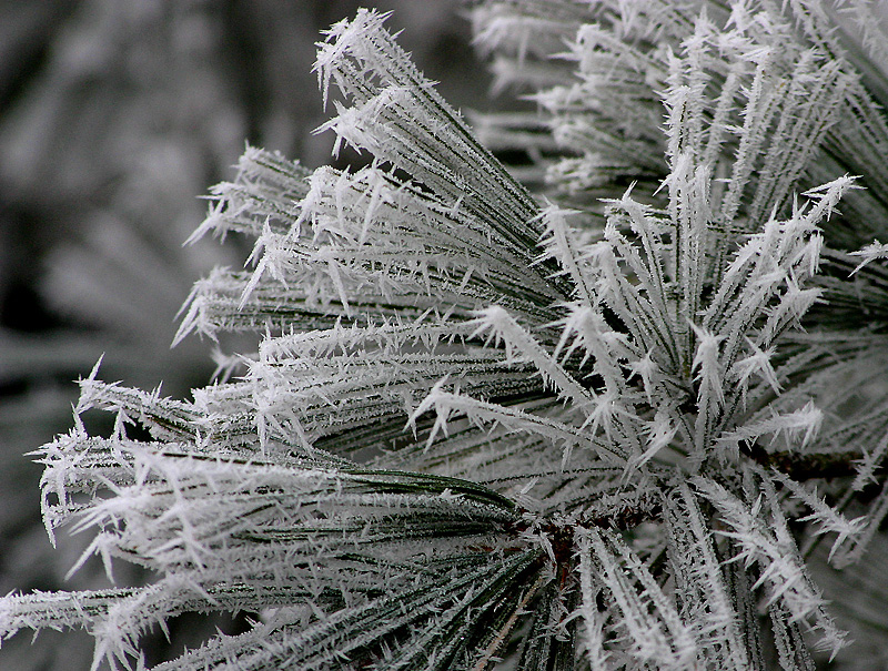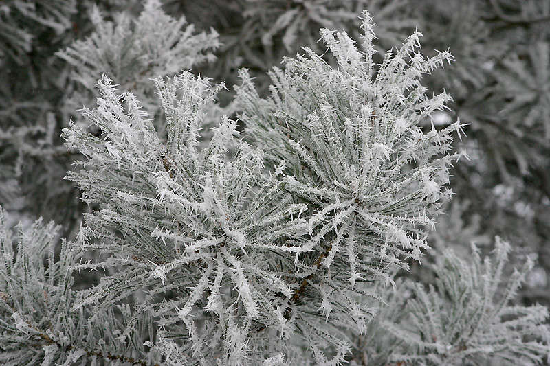 Nun, da ich wieder zu Hause bin, finde ich ein recht ähnliches Bild vor, nur mit anderem "Untergrund". Als ich heute unterwegs war und Felder und Bäume (also Natur - und so was gibt's in München nicht so flächig) gesehen habe, war alles weiß und hat mich an eine Kristallwelt erinnert.