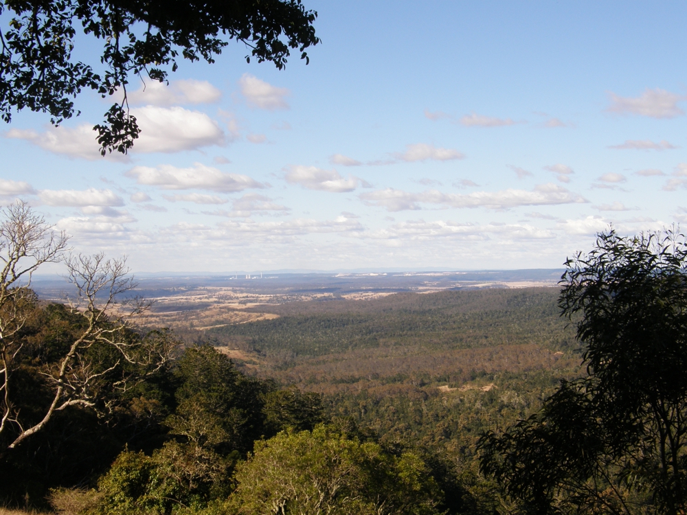 Blick von den Bunyas in Richtung Tagebau und Kraftwerk. Im Wald unmittelbar neben dem Tagebau arbeite ich.